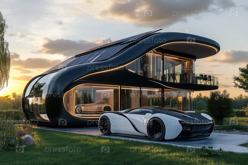 Футуристический электрический спортивный автомобиль припаркован снаружи современного дома на солнечной энергии