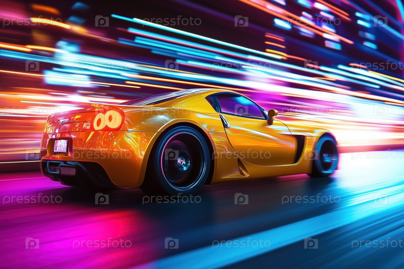 Спортивный автомобиль, движущийся на высокой скорости по улицам Неонного города ночью с Motion Blur