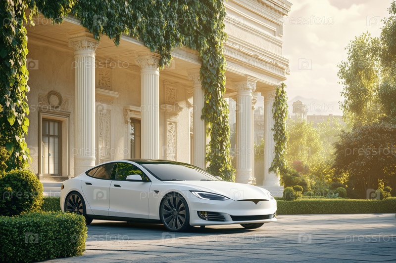 Электрический роскошный седан припаркован снаружи классического здания во время солнечного утра