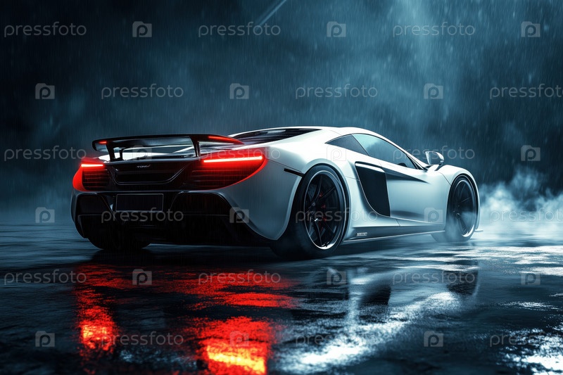 Роскошный спортивный автомобиль, припаркованный на мокрой асфальте, отражающий городские огни ночью