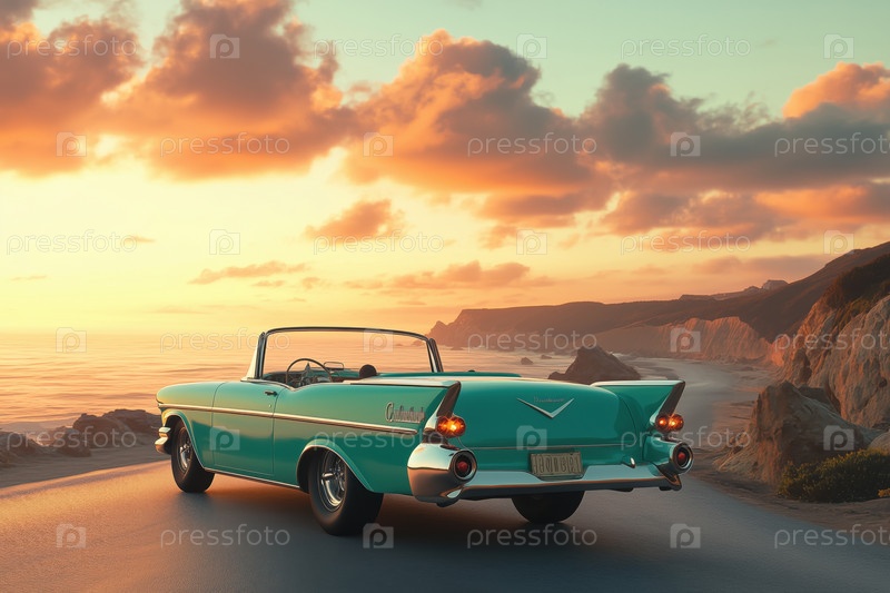 Винтажный кабриолет едет вдоль прибрежной дороги во время живописного захода солнца