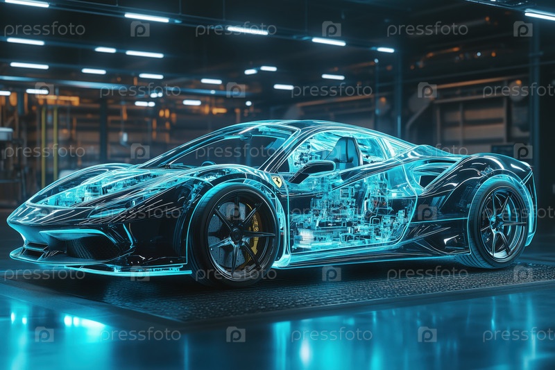 Футуристический спортивный автомобиль демонстрирует прозрачное тело, раскрывающее внутренние компоненты