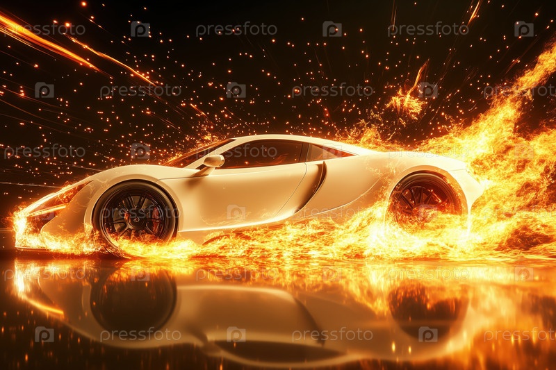 Спортивные автогонки через пламя с искрами, летящими в драматическом движении