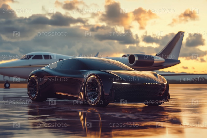 Роскошный спортивный автомобиль, припаркованный рядом с частным самолетом во время захода солнца на взлетно-посадочной полосе аэропорта
