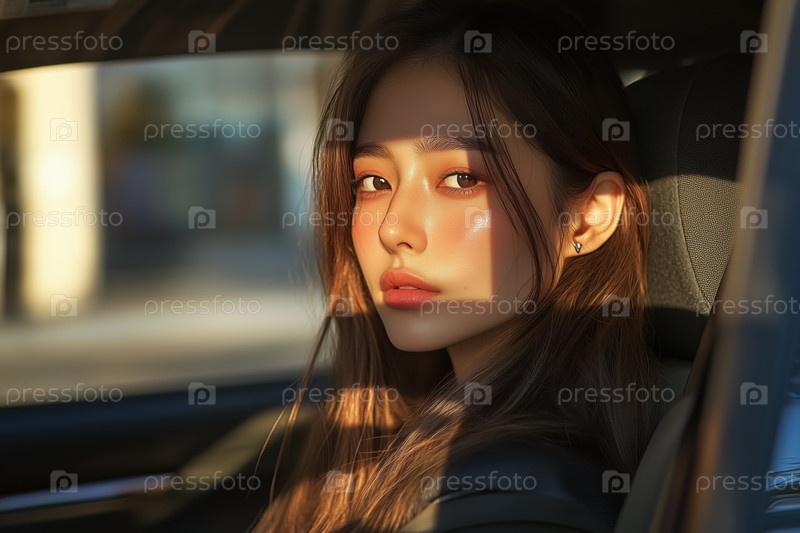 Портрет молодой азиатской женщины, сидящей в машине и смотрящей на камеру