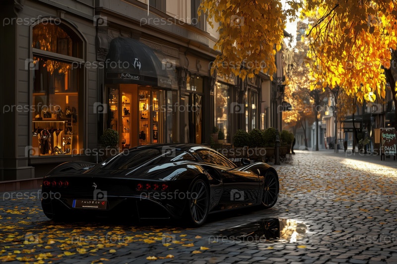 Роскошный черный спортивный автомобиль, припаркованный на улице Коблстоун во время осеннего вечера