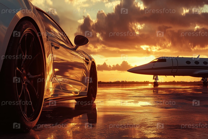 Роскошный спортивный автомобиль и частный самолет отражают закат на мокрой взлётной полосе аэропорта
