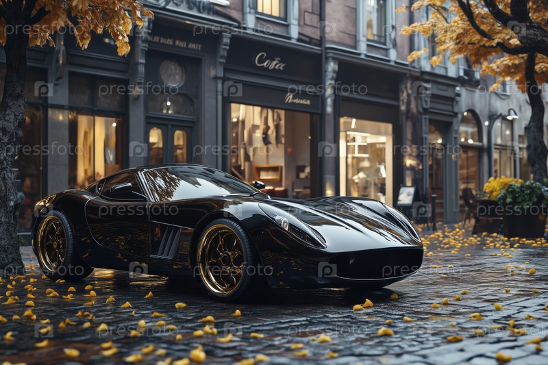 Роскошный спортивный автомобиль, припаркованный на Cobblestone Street в осенней городской обстановке