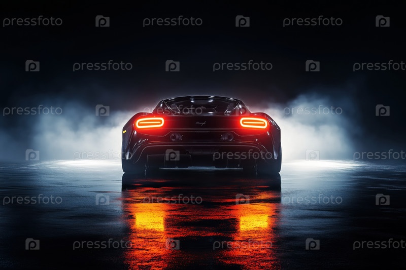 Роскошный спортивный автомобиль, выделяющий дым при освещении мокрого асфальта ночью