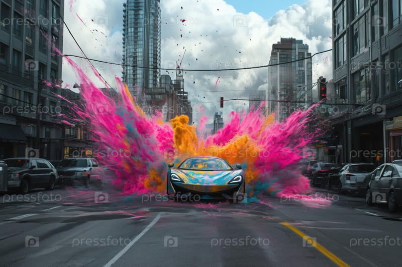 Спортивный автомобиль едет через ярко окрашенные порошковые взрывы на городской улице