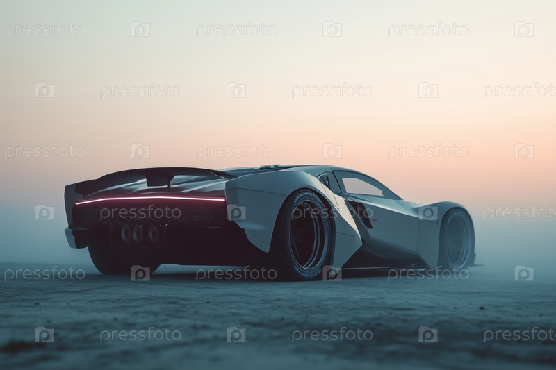 Футуристический спортивный автомобиль припаркован на улице во время восхода солнца, создавая драматический силуэт