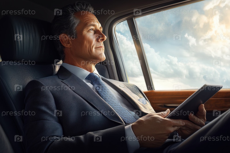 Мужчина средних лет использует цифровой планшет, сидя в машине