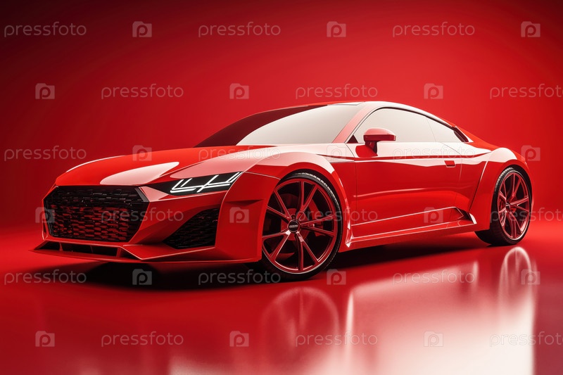 Красный спортивный автомобиль, стоящий на блестящей поверхности в современном освещении студии