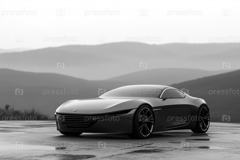 Футуристический электрический спортивный автомобиль, припаркованный на улице против горного пейзажа