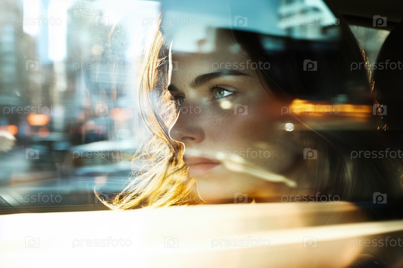 Молодая женщина смотрит в окно автомобиля, отражающее уличные огни города