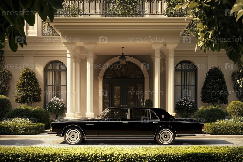 Роскошный черный седан припаркован снаружи элегантного особняка вход на солнечный день