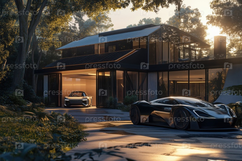 Роскошный дом с современными электрическими спортивными автомобилями, припаркованными на подъезде к закату солнца