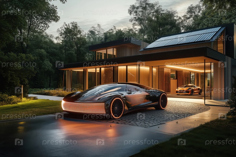 Футуристическая парковка электромобилей снаружи современного экологически дружественного дома на закате