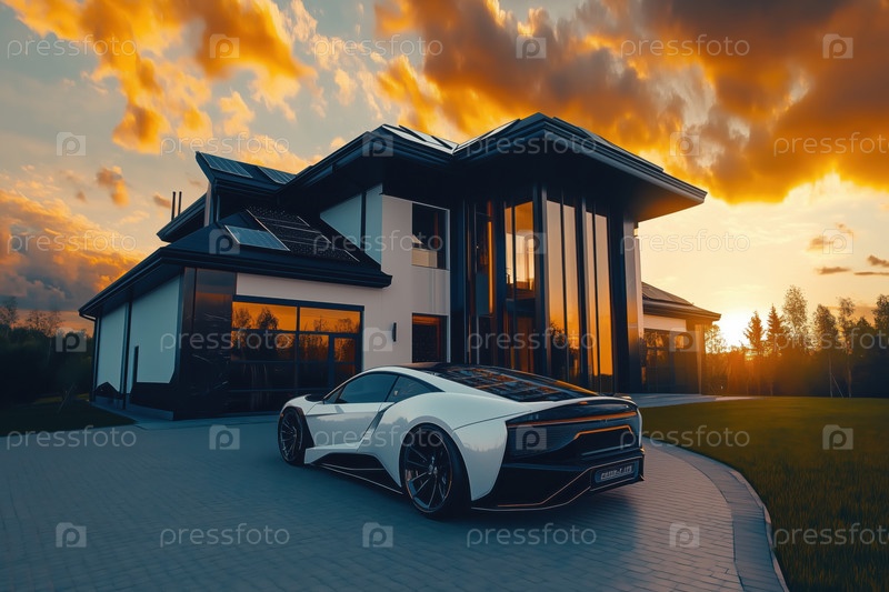 Современный роскошный дом со спортивным автомобилем, припаркованным снаружи во время захода солнца