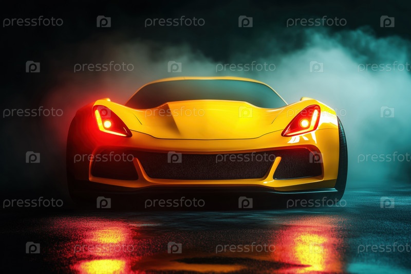 Спортивный автомобиль, освещающий ночную улицу со светофорами и задними фонарями