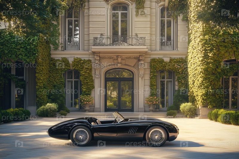 Винтажный черный кабриолет припаркован снаружи роскошного особняка в солнечном свете