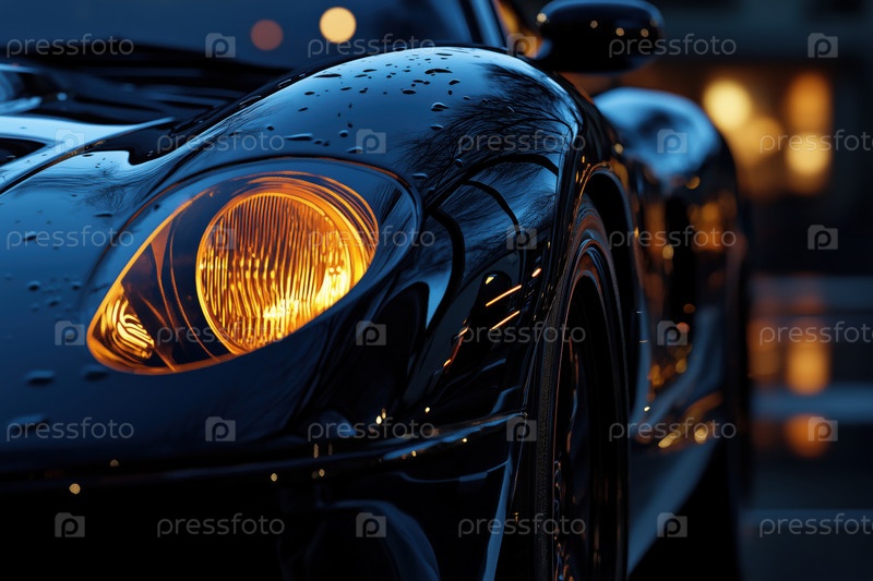 Фары роскошных спортивных автомобилей освещают ночью с капельками дождя на крышке