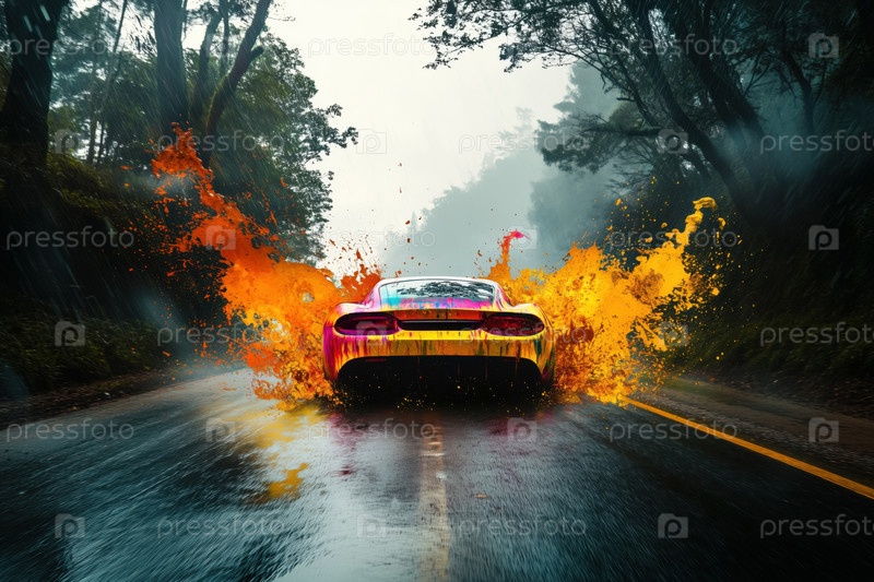 Спортивный автомобиль, создающий яркий эффект плесени краски на мокрой лесной дороге