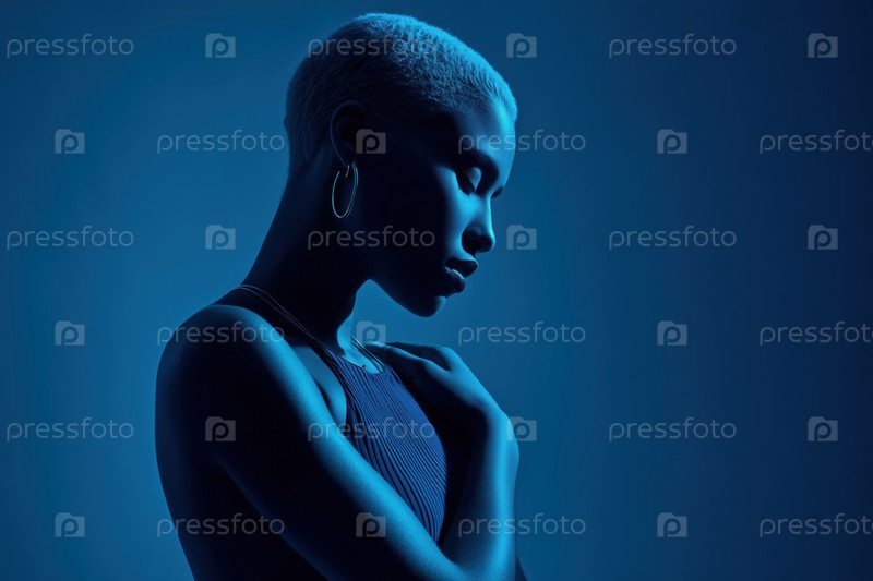Молодая взрослая черная женщина позирует в студии с рукой, опирающейся на плечо