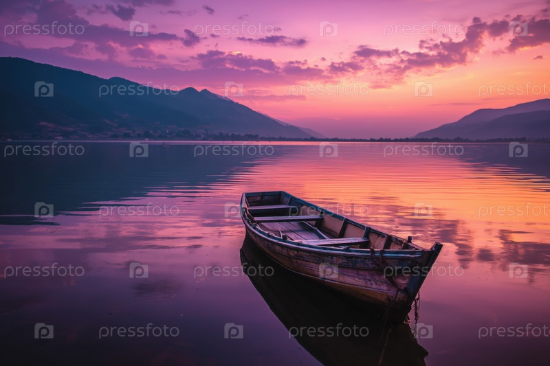Деревянный катер, плавающий на спокойном озере во время яркого отражения заката солнца в горах