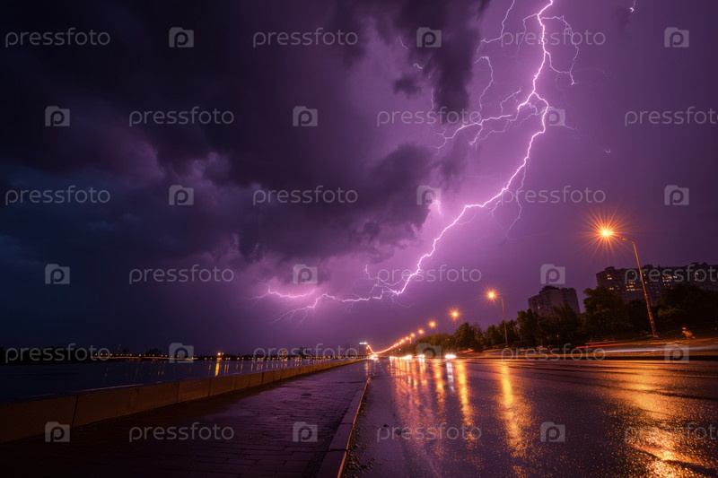 Драматическая молния, поражающая городскую улицу во время интенсивной грозы