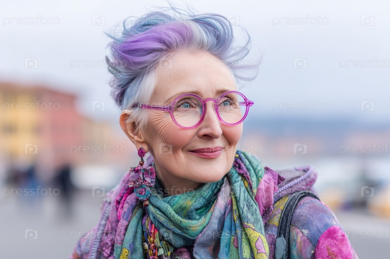 Старшая женщина с красочными волосами улыбается, гуляя на улице