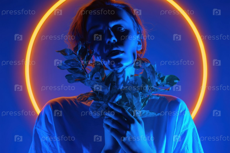 Портрет молодой взрослой женщины, держащей растение под светом неонового круга