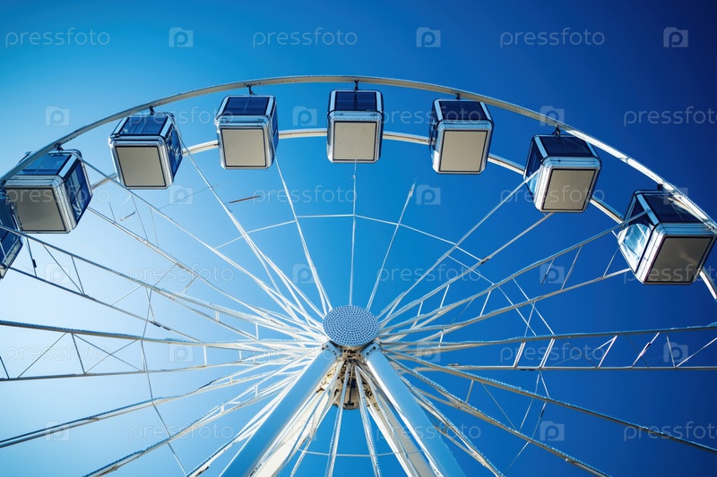 Колесо обозрения вращается против ясного синего неба в яркий солнечный день