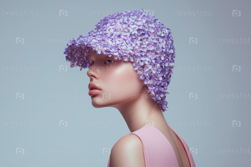 Молодая женщина с цветочной шляпой позирует на нейтральном фоне