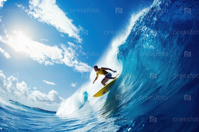 Молодой взрослый мужчина занимается серфингом на океанской волне в солнечный летний день