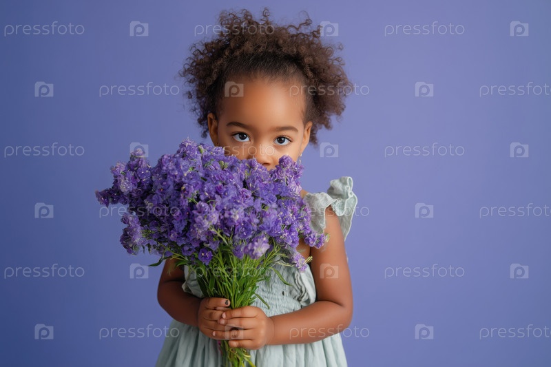 Портрет девушки-чернокожего ребенка, держащей фиолетовые цветы на фиолетовом фоне
