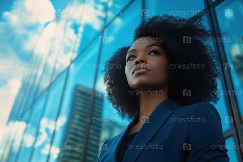 Молодая взрослая чернокожая женщина уверенно стоит за пределами современного офисного здания
