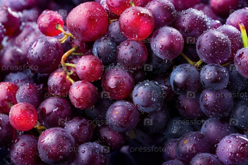 Свежие фиолетовые виноград с водяными капельками, показывающими сочную текстуру и зрелость