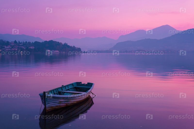 Деревянный катер, плавающий на спокойном озере во время мирного фиолетового заката