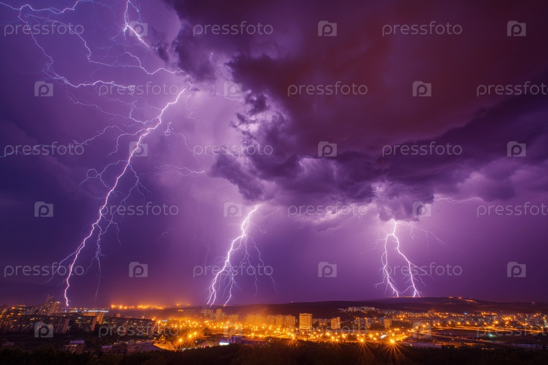 Драматическая молния поражает городской пейзаж во время интенсивной грозовой ночи