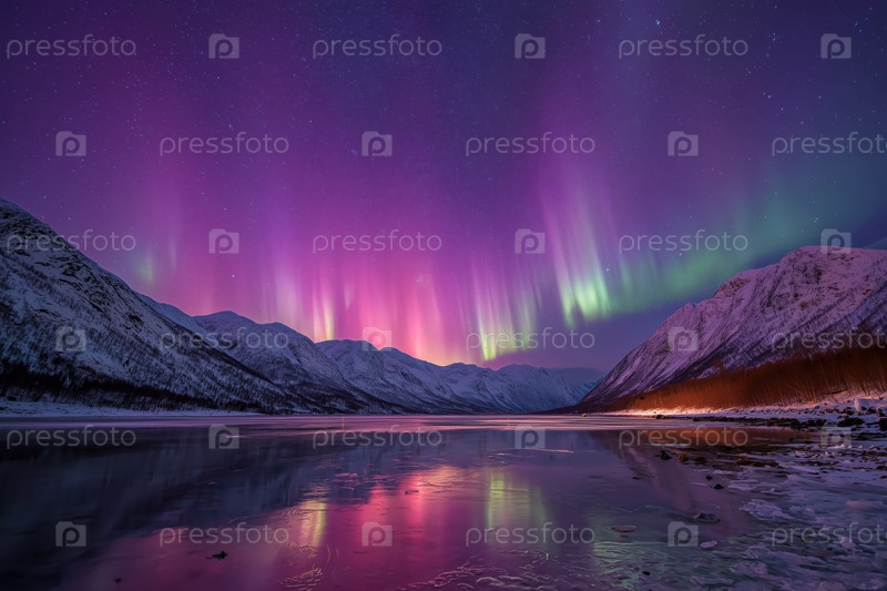 Яркое северное сияние освещает снежную долину, отражающуюся на замороженной реке