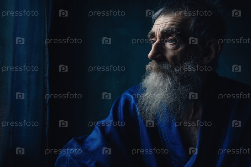 Старший мужчина смотрит в окно, отражая его при слабом освещении