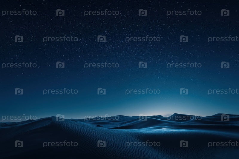 Пустынные песчаные дюны, освещенные лунным светом под звездным ночным небом