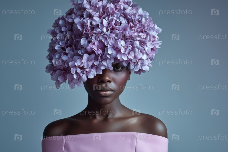 Портрет молодой чернокожей женщины с цветочным головным убором, позирующей уверенно