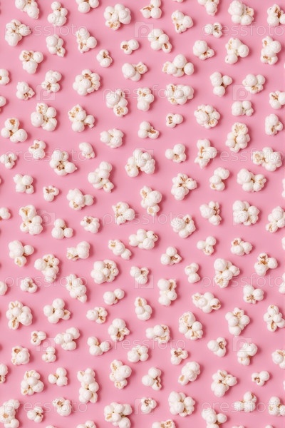 Рассеянные ядра попкорна расположены на розовом фоне, создавая игривый шаблон