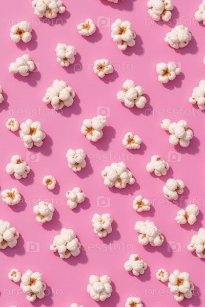 Ядра попкорна разбросаны на розовой поверхности, создавая игривый образ пищи