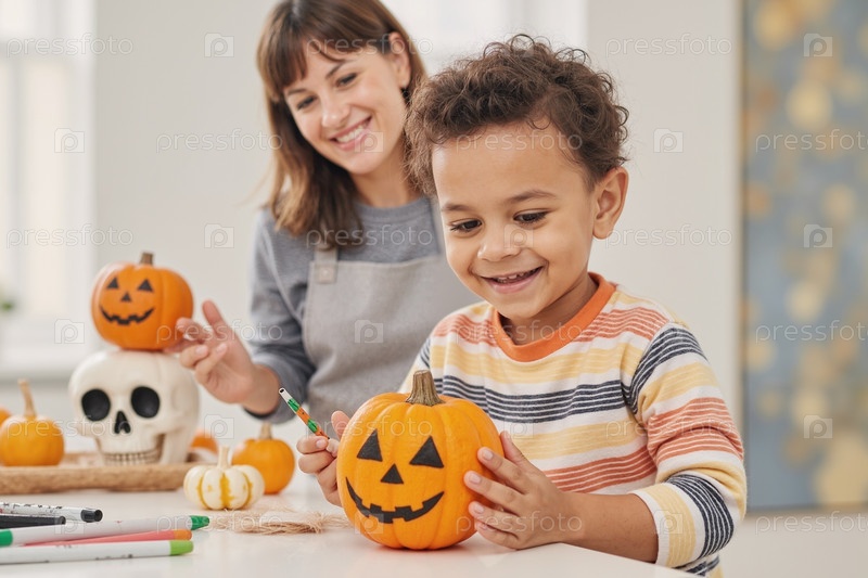 Улыбающийся ребенок украшает тыкву с женщиной на Хэллоуин
