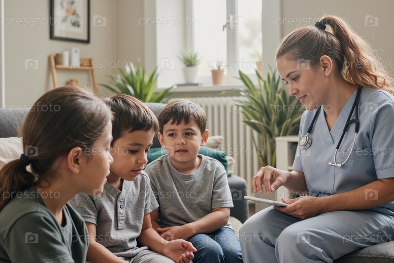 Сестра взаимодействует с группой детей во время консультации
