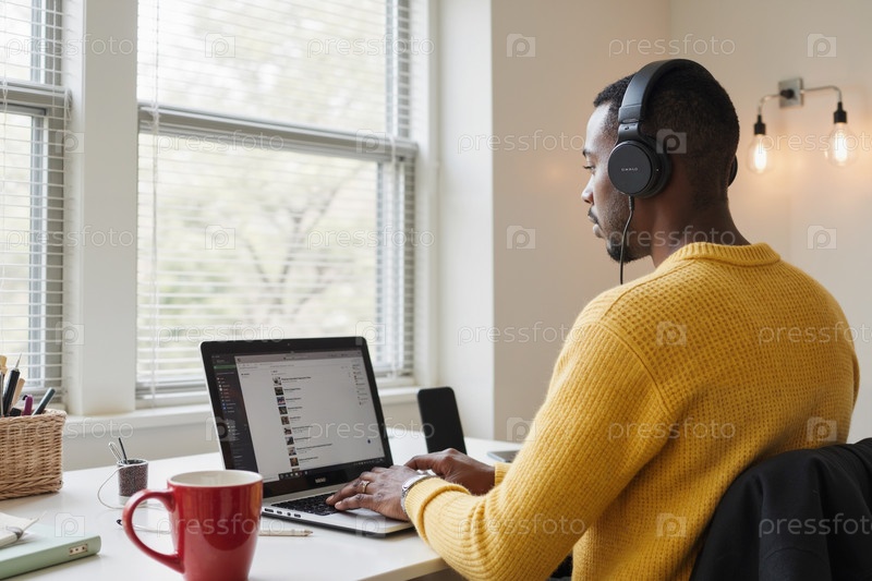 Черный мужчина работает удаленно, используя ноутбук и наушники в помещении
