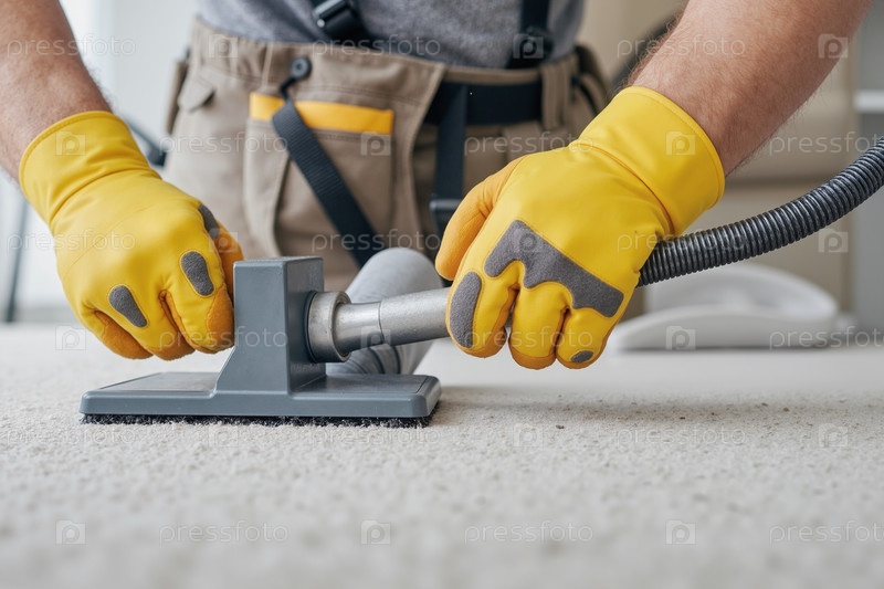 Мужчина чистит ковер с профессиональным пылесосом